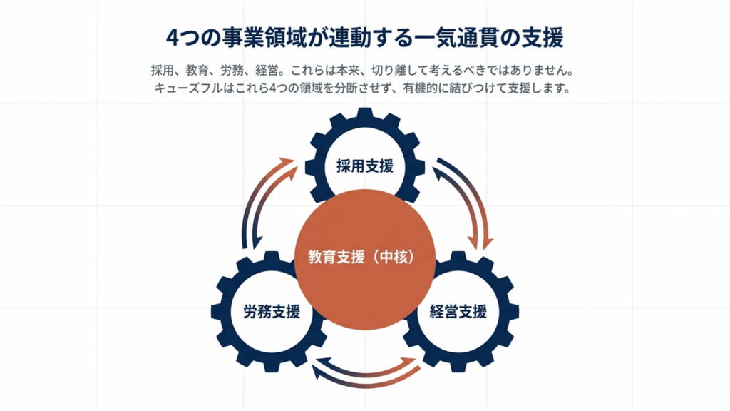 キューズフルは教育を軸に、採用・労務・経営まで支援いたします